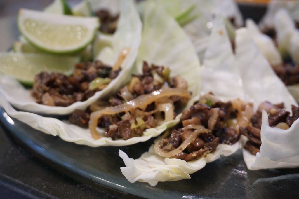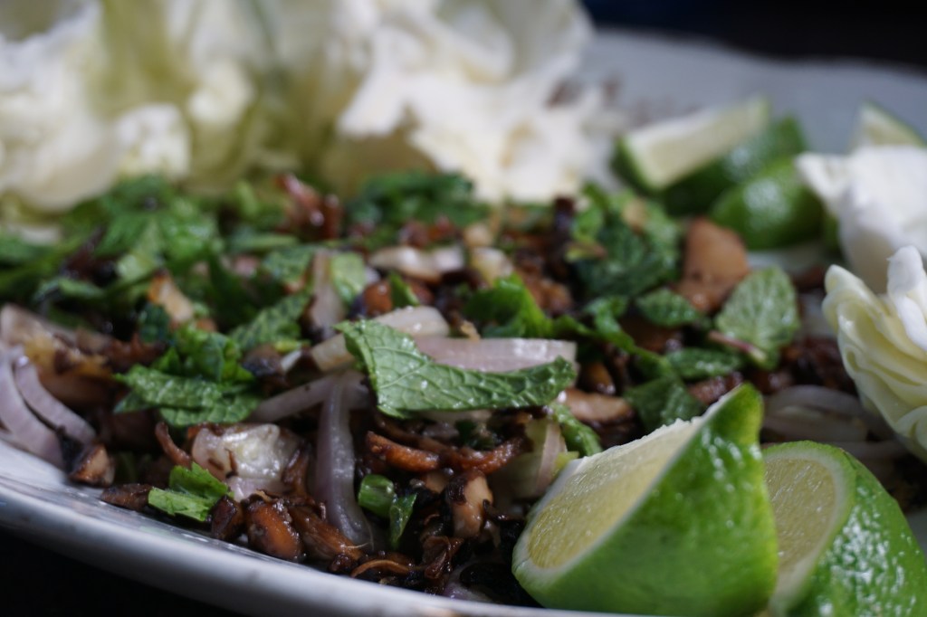 This is a vegetarian version of a super flavorful recipe for a classic Laos and Thai dish. It boasts great taste and texture. It looks beautiful plated either directly in cabbage cups or in a bowl with cabbage and lime wedges on the side. The recipe calls for roasted peanuts, which are a great addition (but it’s also good without).