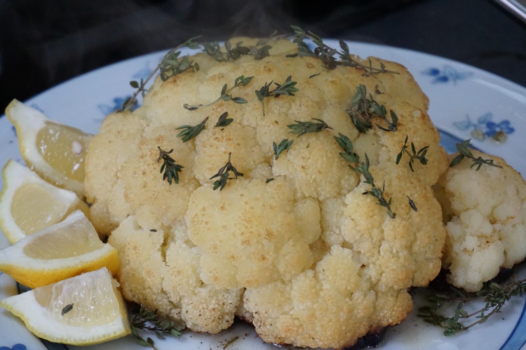 Roast a whole head of cauliflower this way and you will tuck into a crispy on-the-outside but tender on-the-inside beautifully golden treat. Sprinkle with fresh herbs, serve it as is, or carve it up. Whichever way you choose, it won’t last long on the platter. This is my take on a method I first noticed described in the cookbook Ready or Not by Michelle Tam from Nom Nom Paleo. When I make it, even the kids come running!