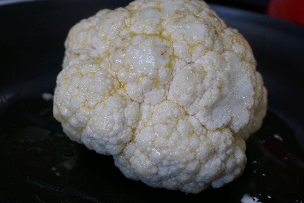 3. Rinse the cauliflower and drizzle olive oil inside and then rub the oil on the surface. Season with salt (bottom and top).