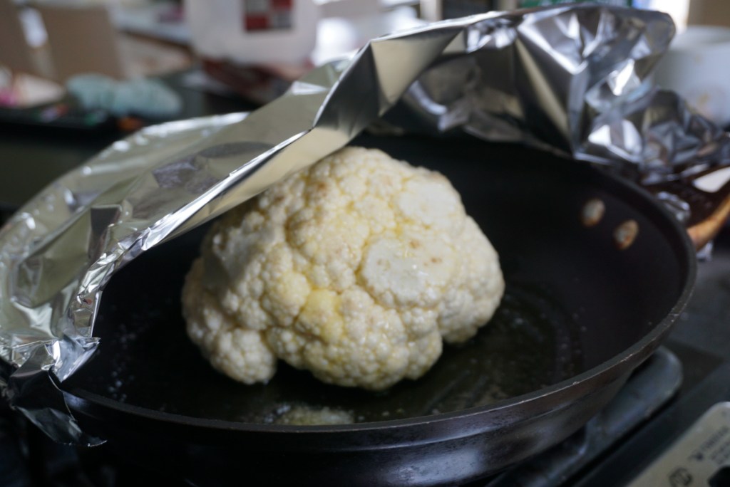 4. Place the cauliflower florets side up in a cast-iron skillet and cover it with aluminum foil.