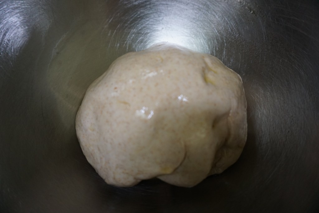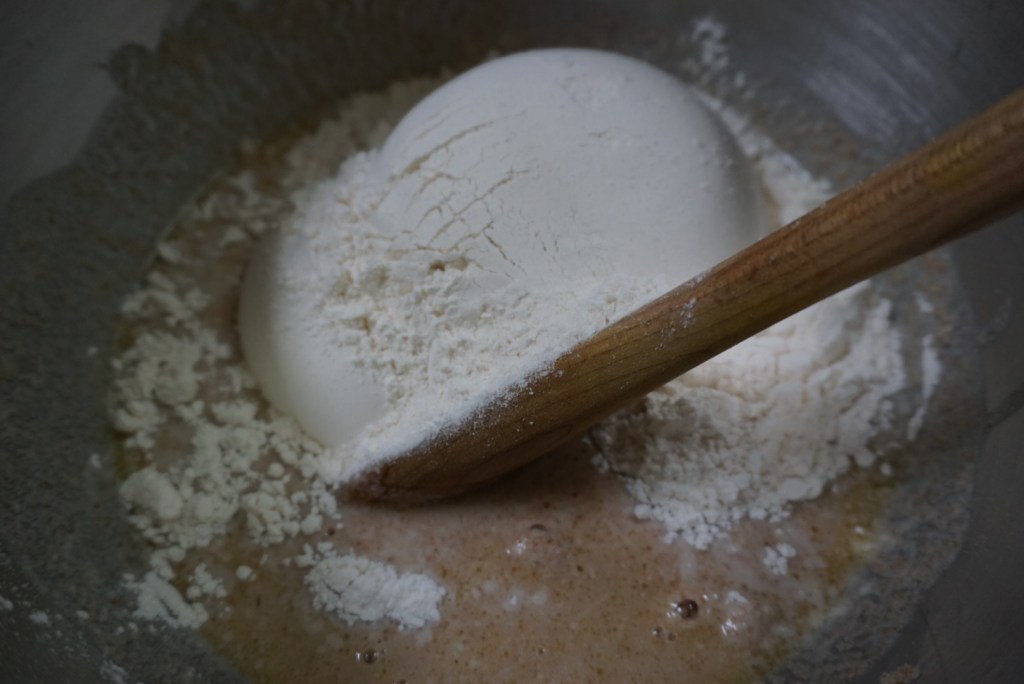 - Combine water, oil, sugar, yeast, salt, and whole wheat flour with a wooden spoon until smooth. Stir in all-purpose flour until the mixture comes together. It will be shaggy looking.
