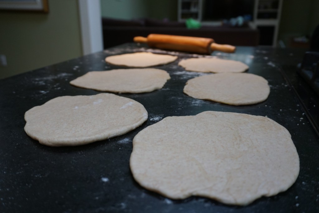 5. Roll each piece of dough into about a 7-inch circle, no more than 1/4 inch thick, taking care not to tear dough. Try to keep the thickness even all around. Place dough disks on a lightly floured surface, cover with a damp towel for about 30 minutes. They should become slightly puffy.