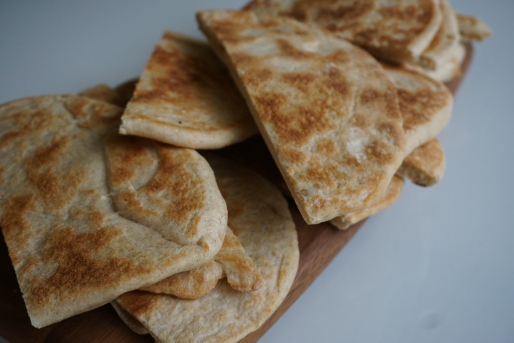 9. For an extra charred finish, heat a cast iron skillet on the stovetop over high heat until smoking. Working with one pita at a time, briefly heat each side until charred in a few spots, about 30 seconds. Return pita to towel and cover. Repeat with remaining pitas and serve immediately.