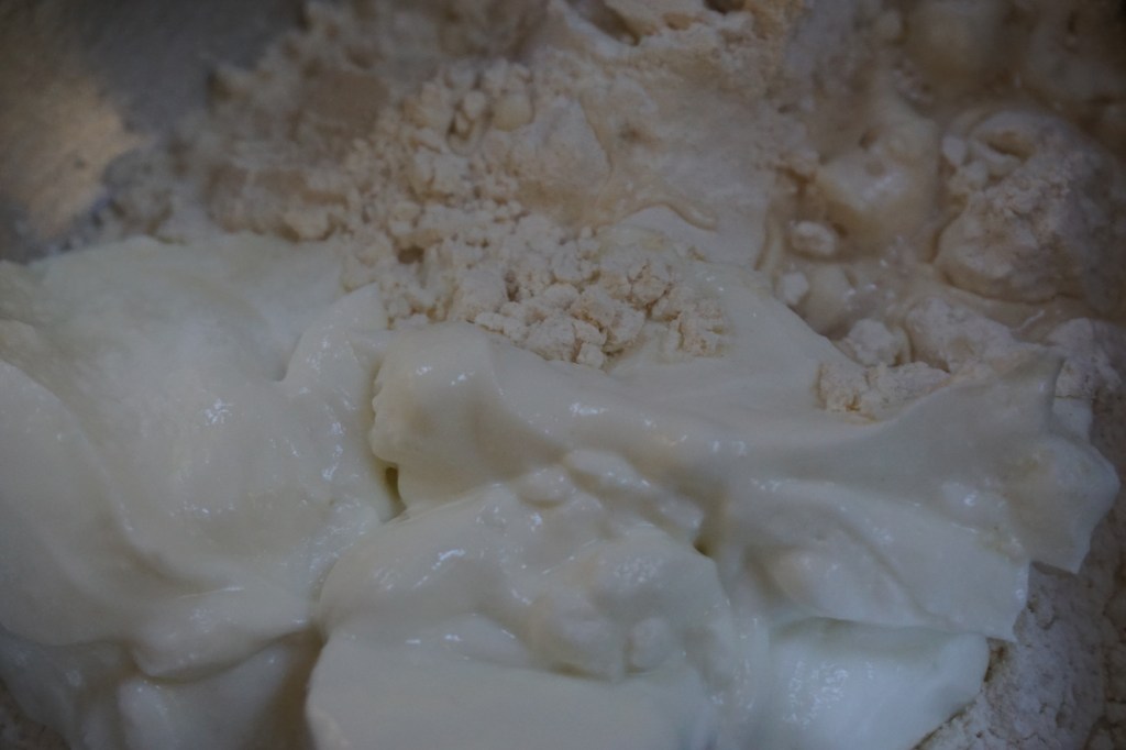 - Combine flour, salt, and baking powder in a large bowl. Add yogurt and the first two tablespoons of water and stir to combine — some mashing will be needed. For plain, non-Greek yogurt, you might need 1 more tablespoon of water to bring it together. I used non-fat greek yogurt and I needed 2 more tablespoons of water (total 4 tablespoons).