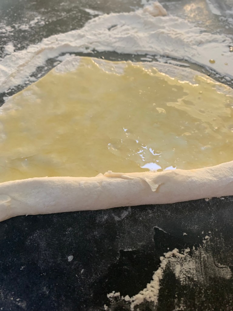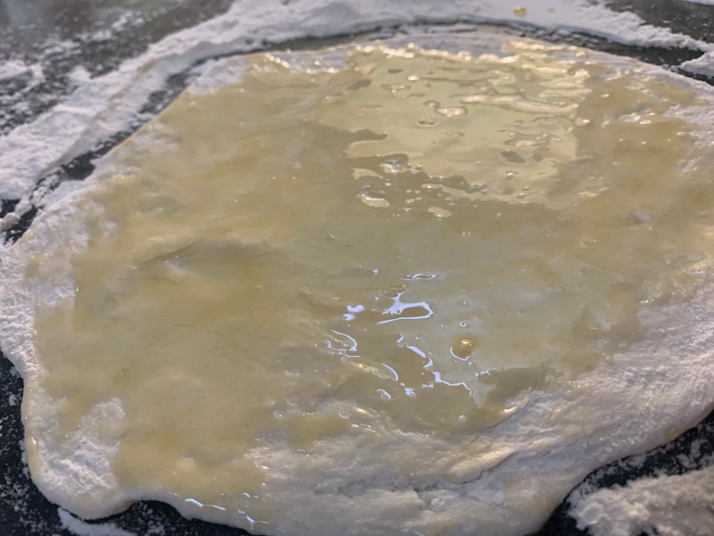 10. Brush the top with more extra-virgin olive oil (or butter, ghee or coconut oil). Warm a frying pan on the stove (medium-low). Leave the remaining coils covered until you are ready to roll them out and brush with olive oil.