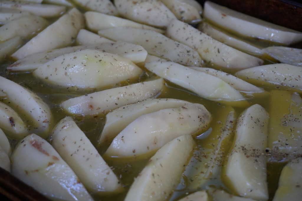 - Prepare another rimmed baking sheet with the chicken broth, lemon juice, olive oil and 1 tbsp of kosher salt. Gently add the now-cooled potatoes, coat them gently with the liquid mixture. Make sure they are placed in one layer. Sprinkle with dried oregano.