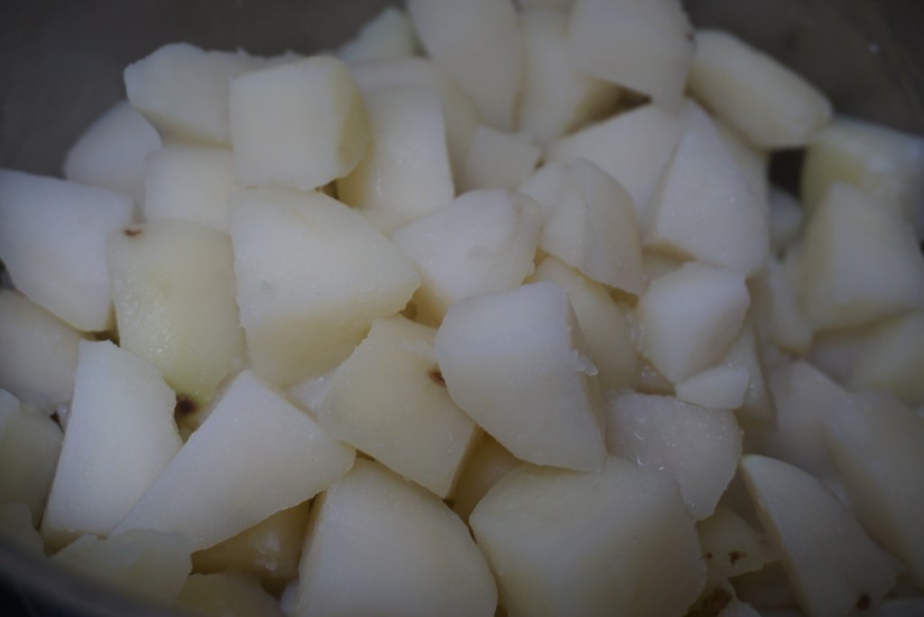 - While waiting for the water to boil, peel and dice up the potatoes into cubes.