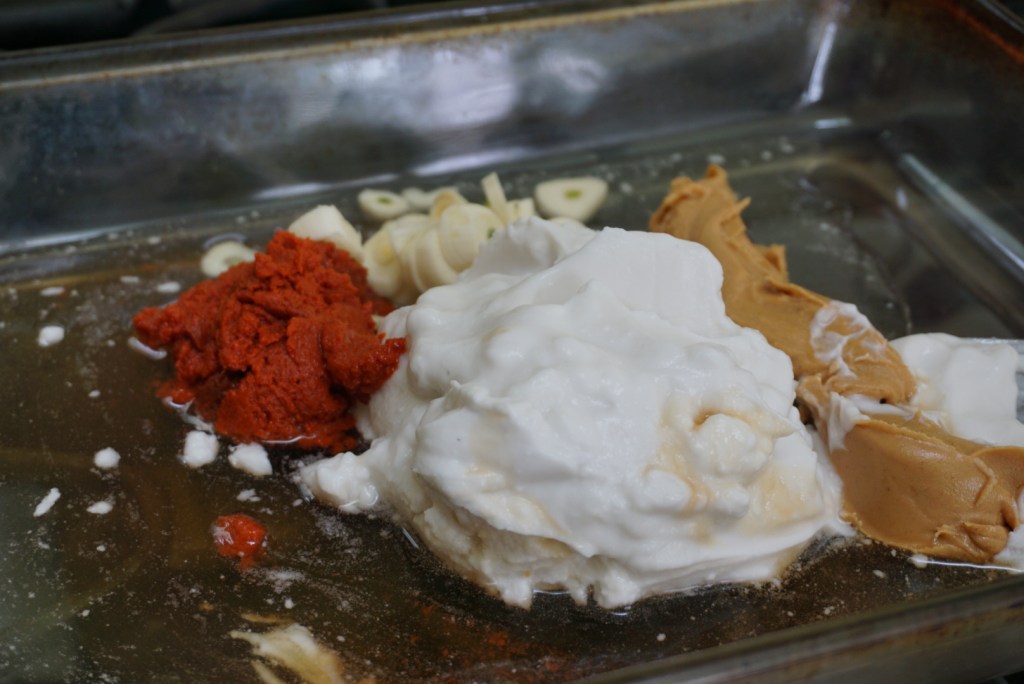 - Pre-heat the oven to 400℉. In a 9-by-13 inch baking pan, combine 1 cup of the coconut milk with the red curry paste, peanut butter, fish sauce and garlic.