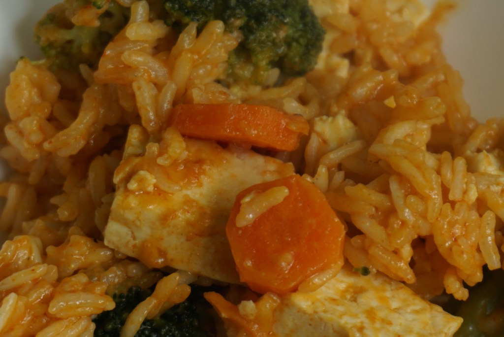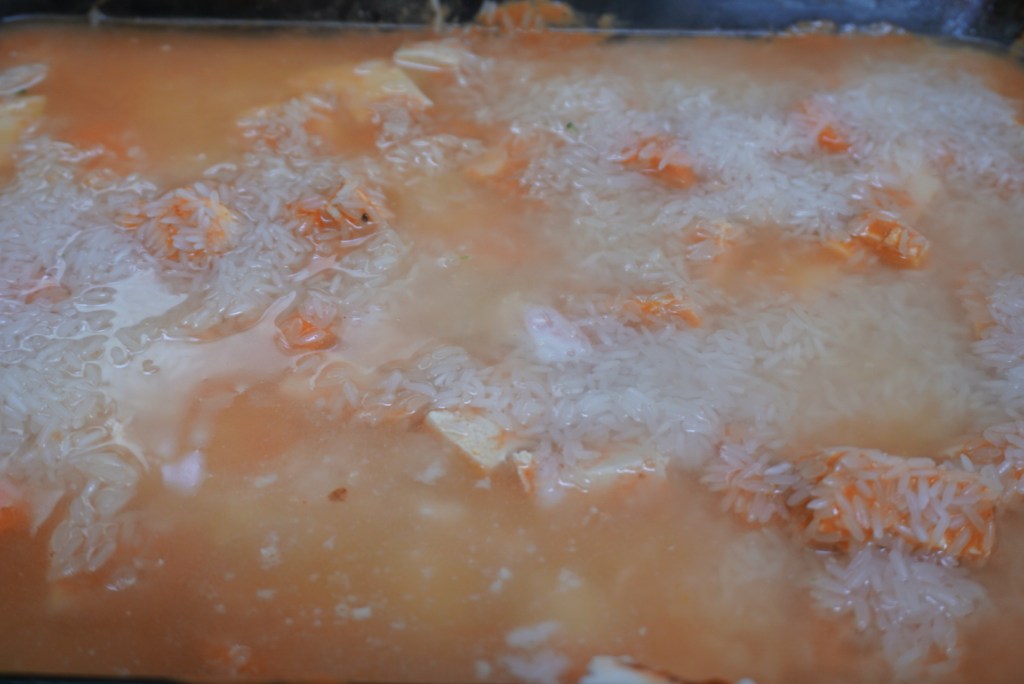 - Add the chicken and carrots, then scatter the rice over everything. (The photos below are with tofu).