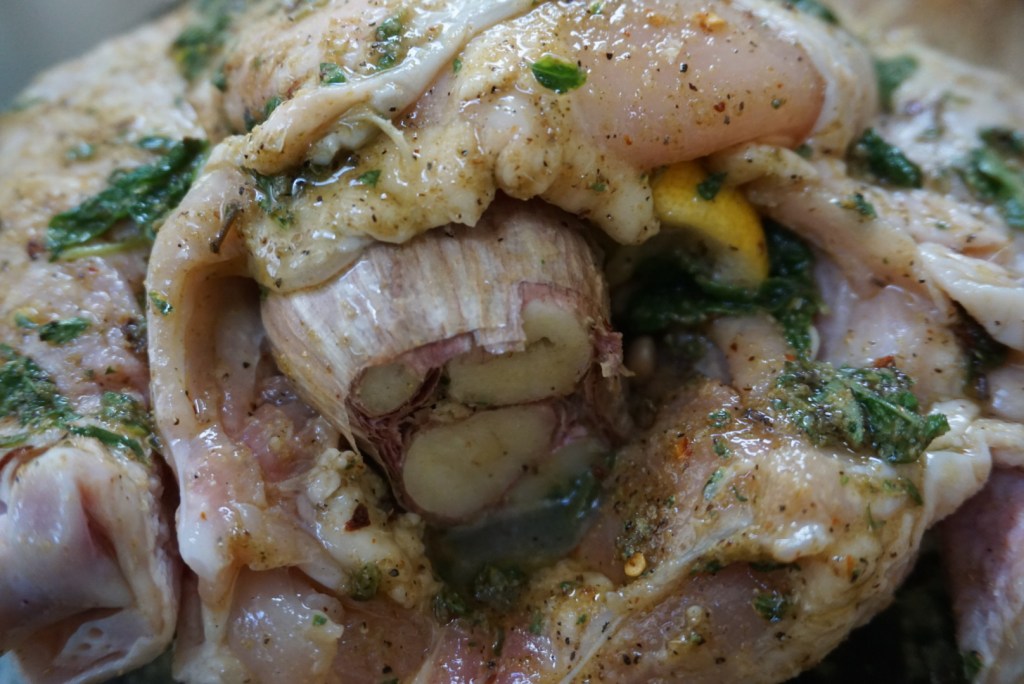 - Rub the chicken inside and out with the spice mixture. Stuff the chicken with lemon, and garlic.