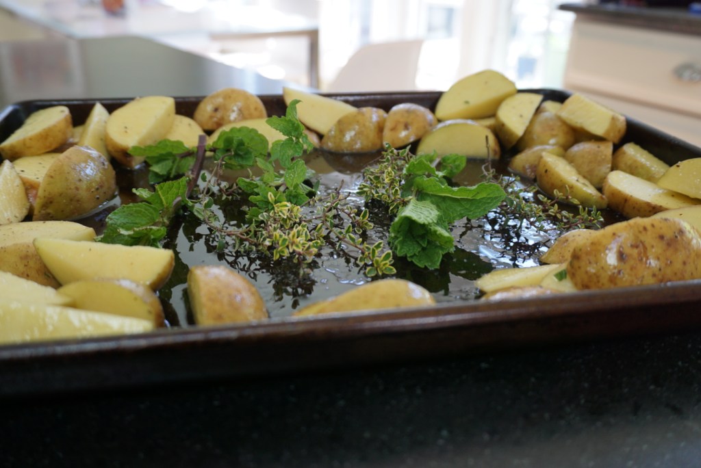 6. Place the potatoes along the edges of the baking sheet and scatter the remaining sprigs of thyme and mint in the center; then place the chicken on the herbs.