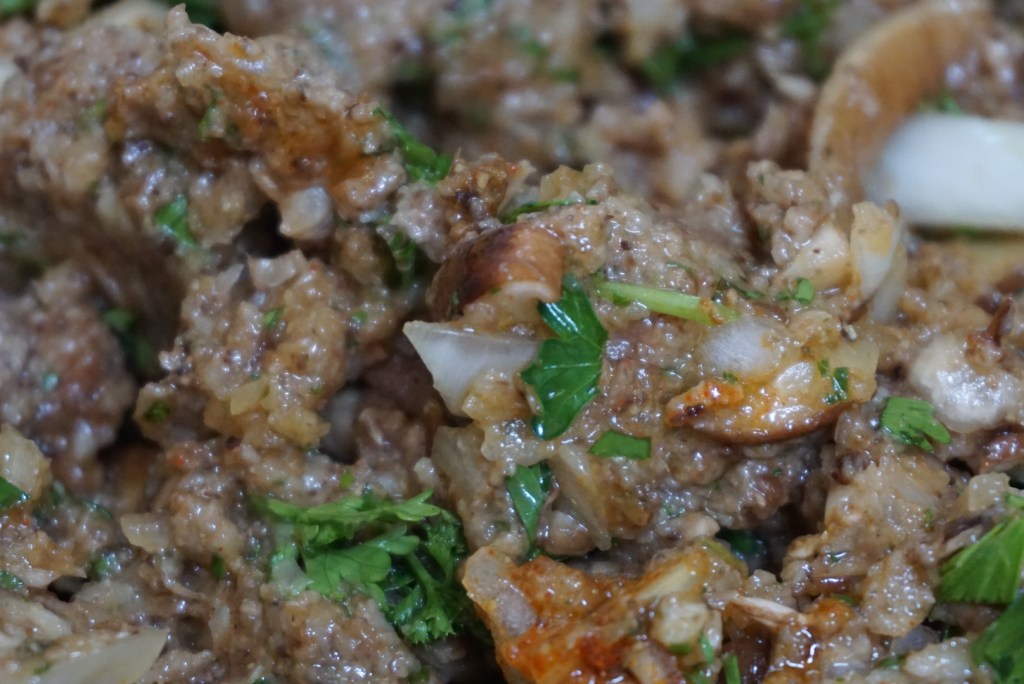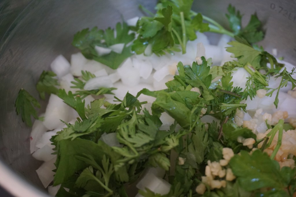 - Add the onion, garlic, olive oil, parsley, cilantro, cumin, salt, paprika, and pepper. A few quick pulses of the food processor to get it all mixed together.