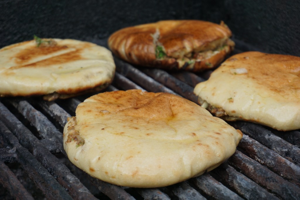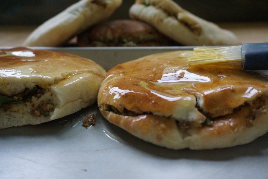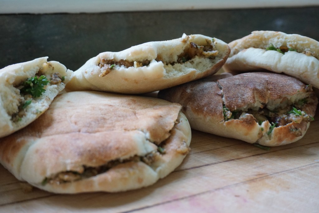 - Brush the outsides of the pitas with olive oil and then grill the arayes until each side is charred and the mushroom filling is hot, about 2-3 minutes per side.