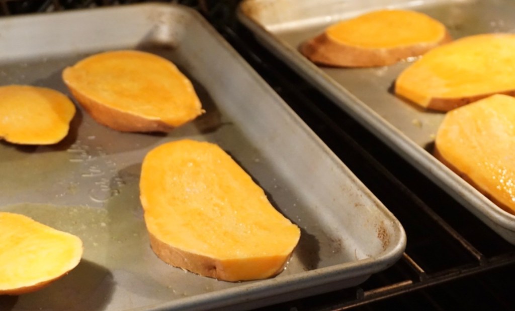 - Place the sweet potato slices on one or two baking sheet (make sure they are spread out so they can roast and not steam). Drizzle with olive oil and turn them over to get both sides. Sprinkle with kosher salt.