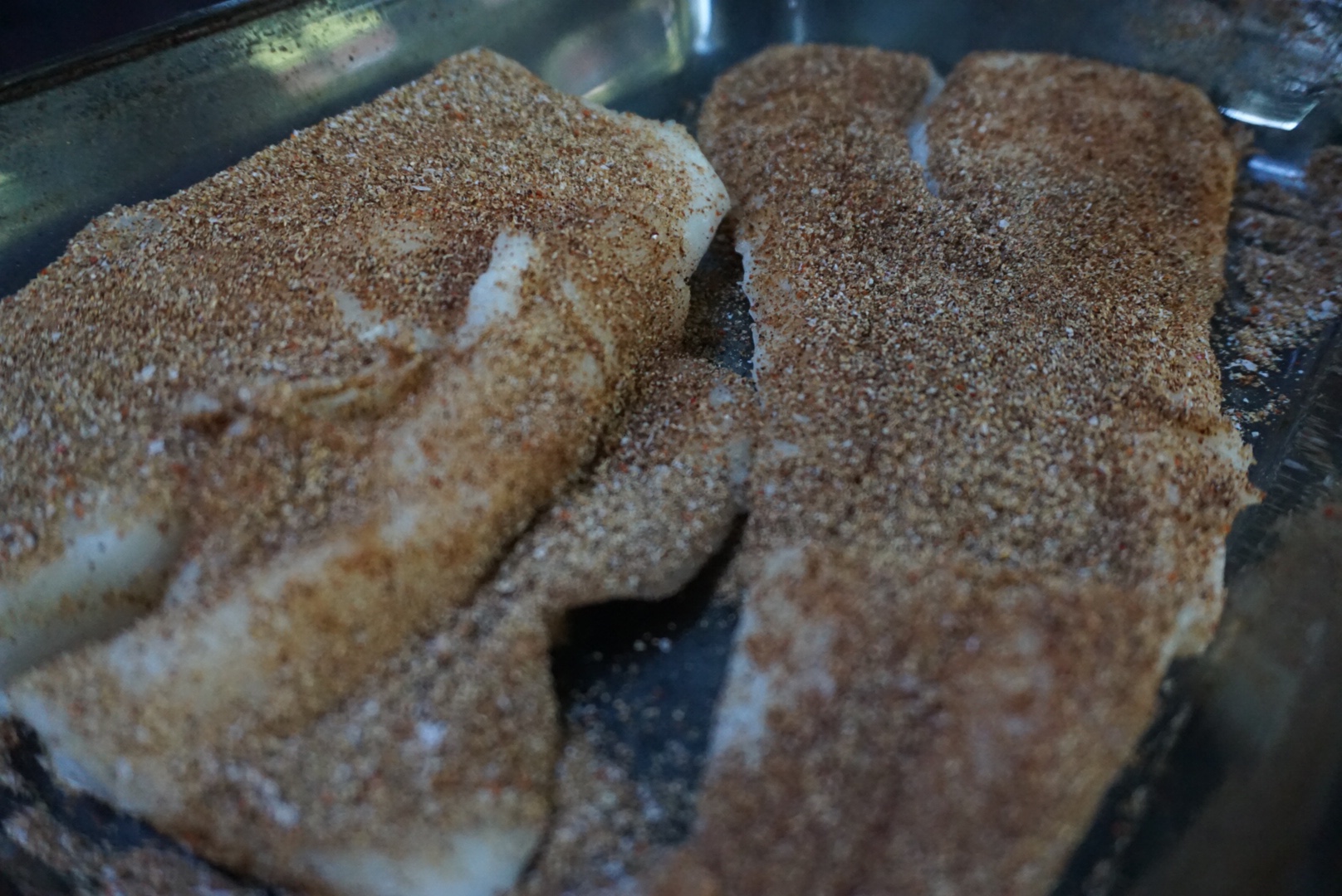 2. Pat the fish dry. Stir the dry rub spices together and sprinkle it on all sides of the fish.