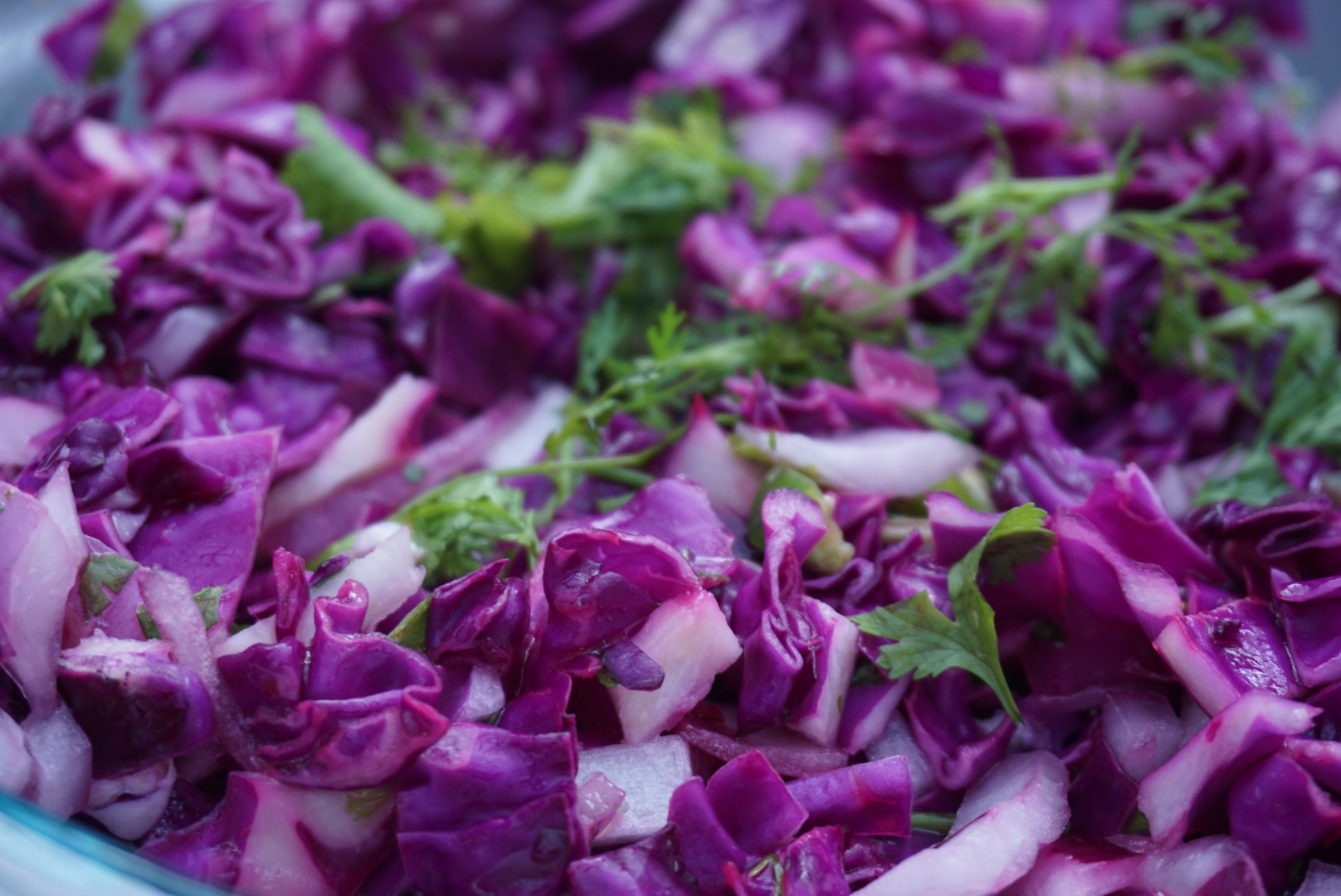 3. Place the chopped or shredded cabbage into a medium sized bowl, and toss with the olive oil, lime juice, onion, salt, jalapeño. Adjust seasoning to your taste. Toss in the cilantro and mix together. The slaw keeps well in the fridge for a a few days.