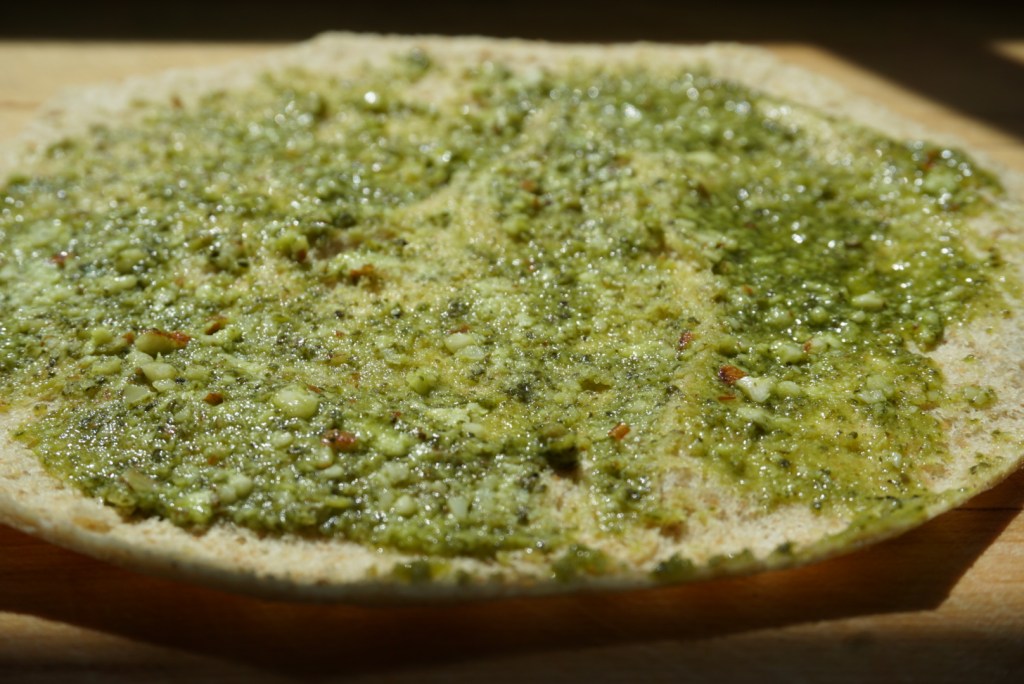 - Place the pita, pesto side down, onto the egg and olive mixture and press down to get it to adhere.