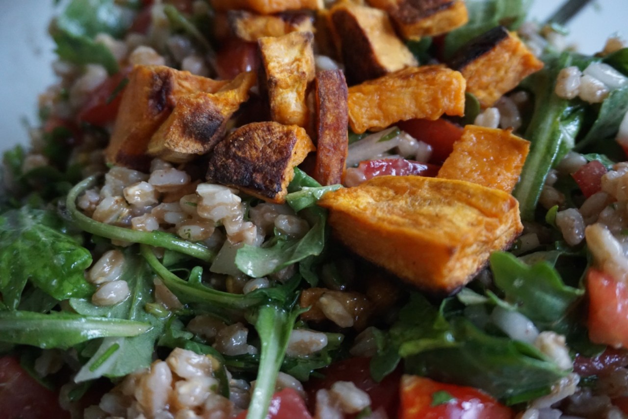 refreshing on a summer day When it’s about 97 degrees outside nobody really feels like standing over a hot stove to prepare the next meal. This tasty grain salad with roasted cubed sweet potatoes, chopped fresh herbs, peppery arugula, diced fresh tomatoes, and sweet onion all drizzled with a refreshing sharp red wine vinaigrette will …