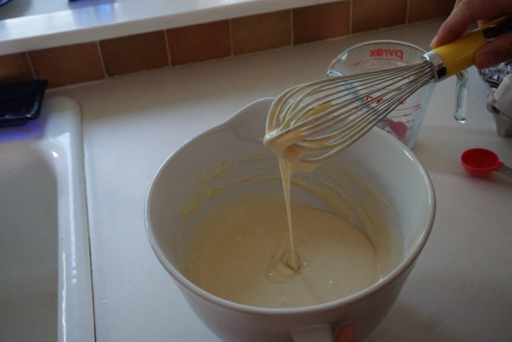 4. Gently whisk the wet into the dry ingredients, stirring to fold. Don’t overmix. The batter will thicken slightly while you’re waiting for the pan (flat or skillet) to heat up.
