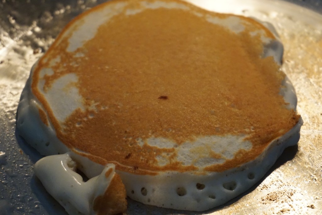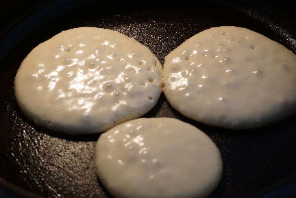 5. Drop 1/4 cupfuls of batter onto the lightly greased pan. Let it sit undisturbed until bubbles begin to form (about two minutes). Then flip to the other side and cook for another 1 to 1 1/2 minutes (try to avoid a second flip, which will flatten the pancakes out).
