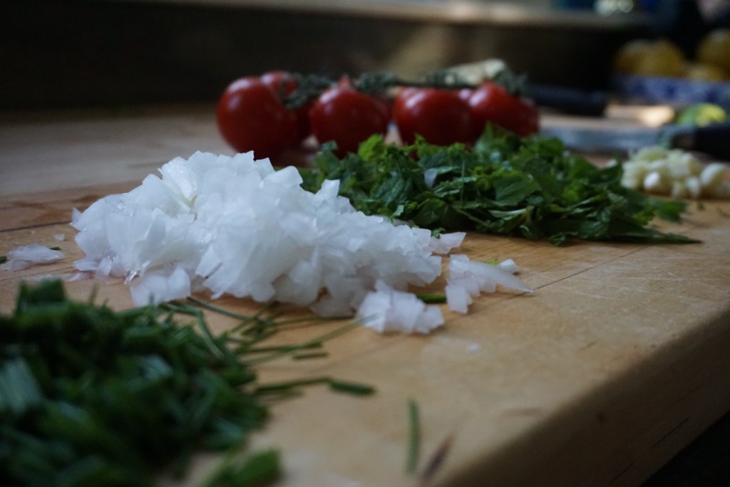 3. Top the Farro with the chopped onion, herbs, and diced tomatoes.