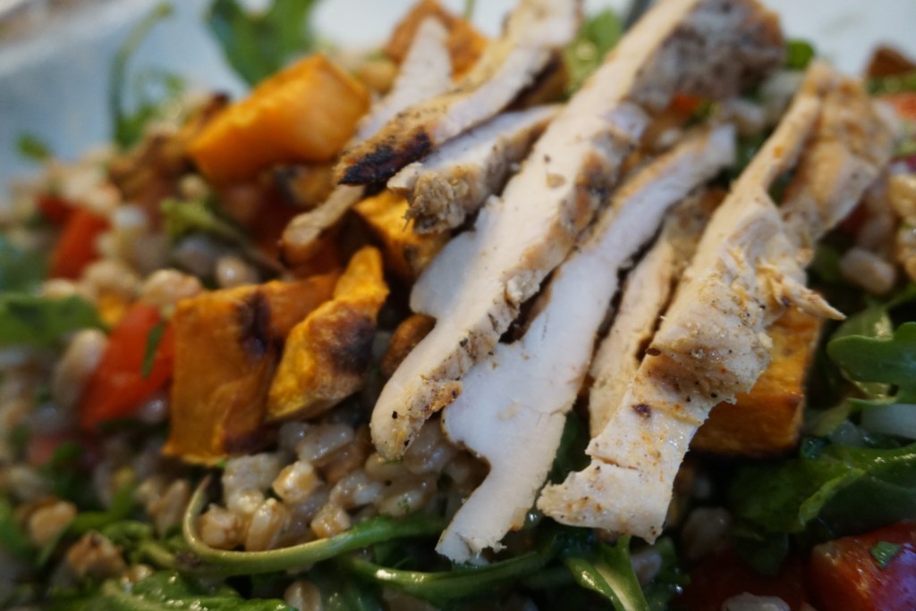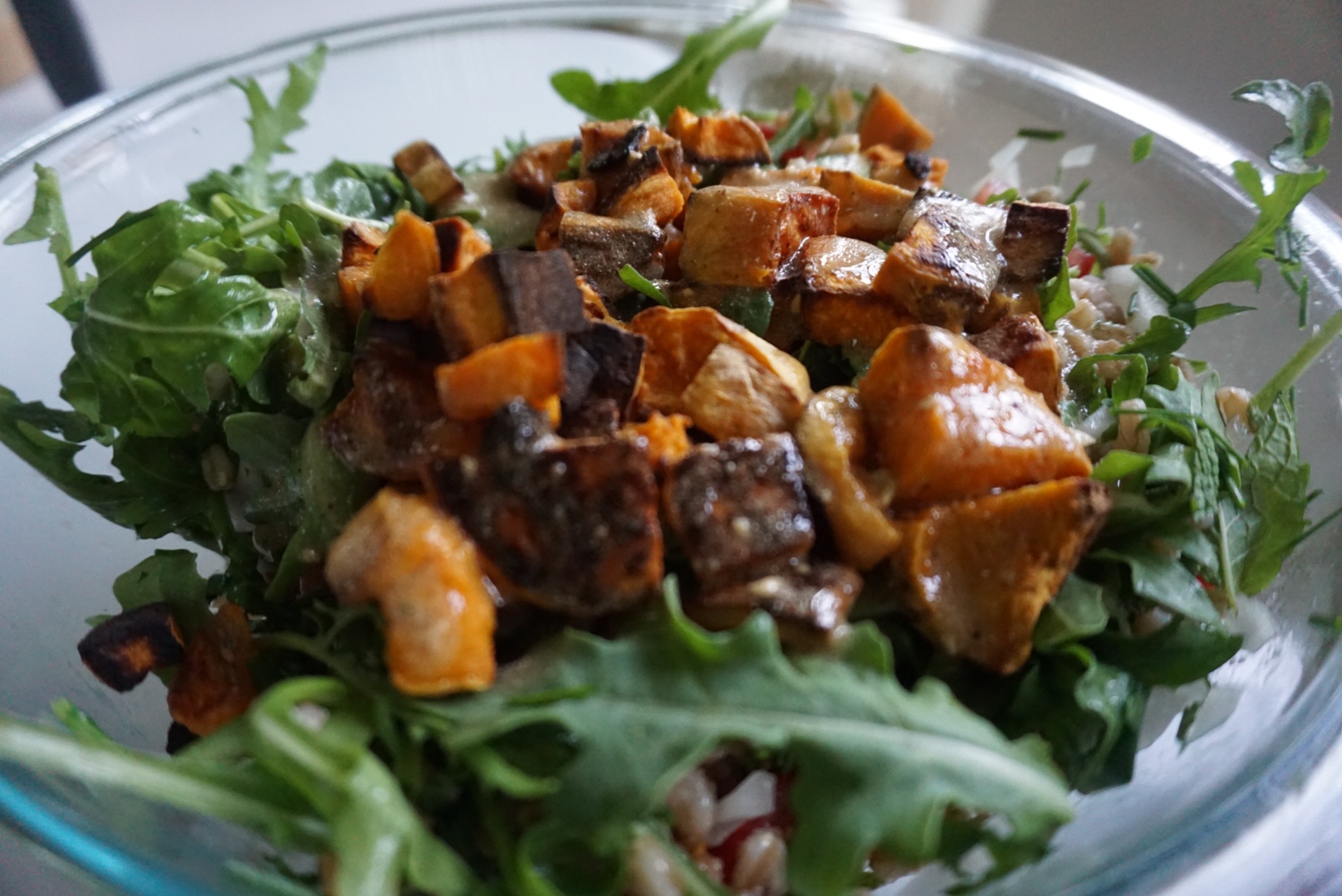 When it’s about 97 degrees outside nobody really feels like standing over a hot stove to prepare the next meal. This tasty grain salad with roasted cubed sweet potatoes, chopped fresh herbs, peppery arugula, diced fresh tomatoes, and sweet onion all drizzled with a refreshing sharp red wine vinaigrette will be perfect for dinner and even better as leftovers for lunch the next day.