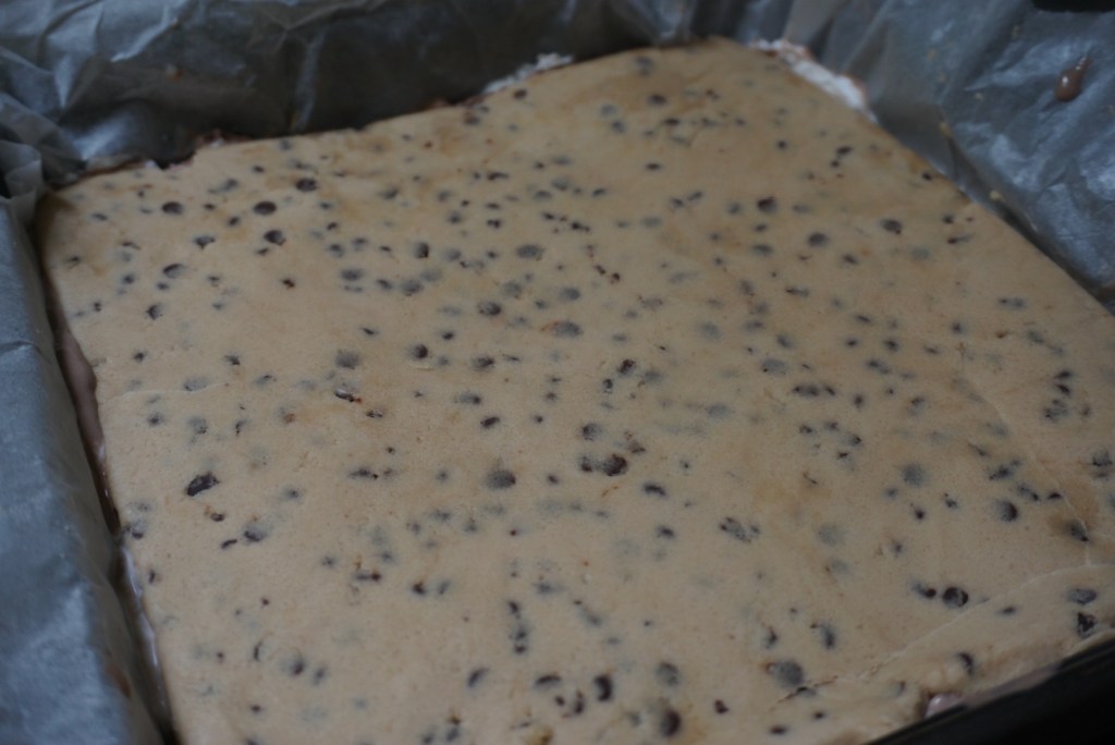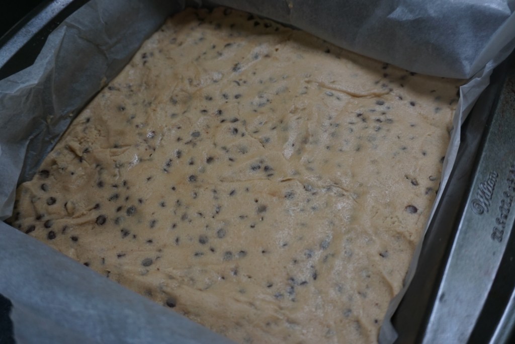 6. Line an 8×8 or 9×9 inch pan with parchment paper (let it overhang the edges of the pan to make it easier for lifting the layer out of the pan- see photo below). Spoon in half of the cookie dough mixture and spread it out evenly until you have a nice flat and even layer. I like to use a second piece of parchment paper on top of the dough to make it easier to flatten it out (you can use your palm or a dough blade to help smooth out the layer).