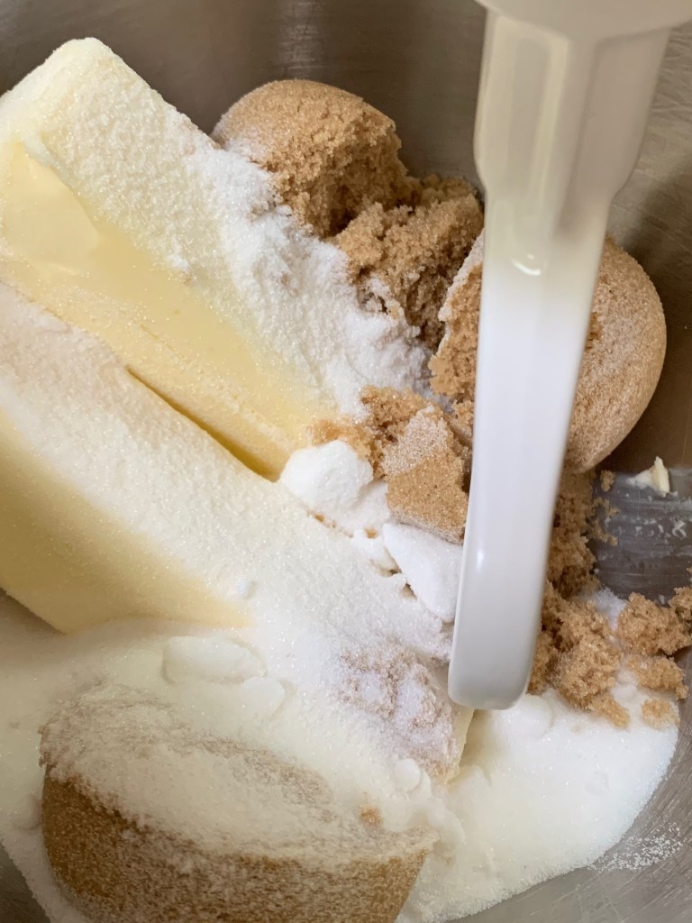 - In an electric mixer with a padded attachment, beat the butter, brown sugar, sugar on medium-high speed for 3 minutes or until light and fluffy. You will need to scrape down the bowl with a spatula.